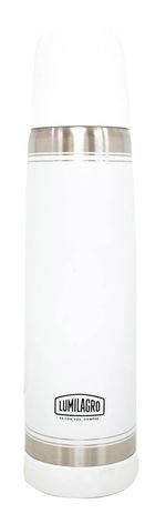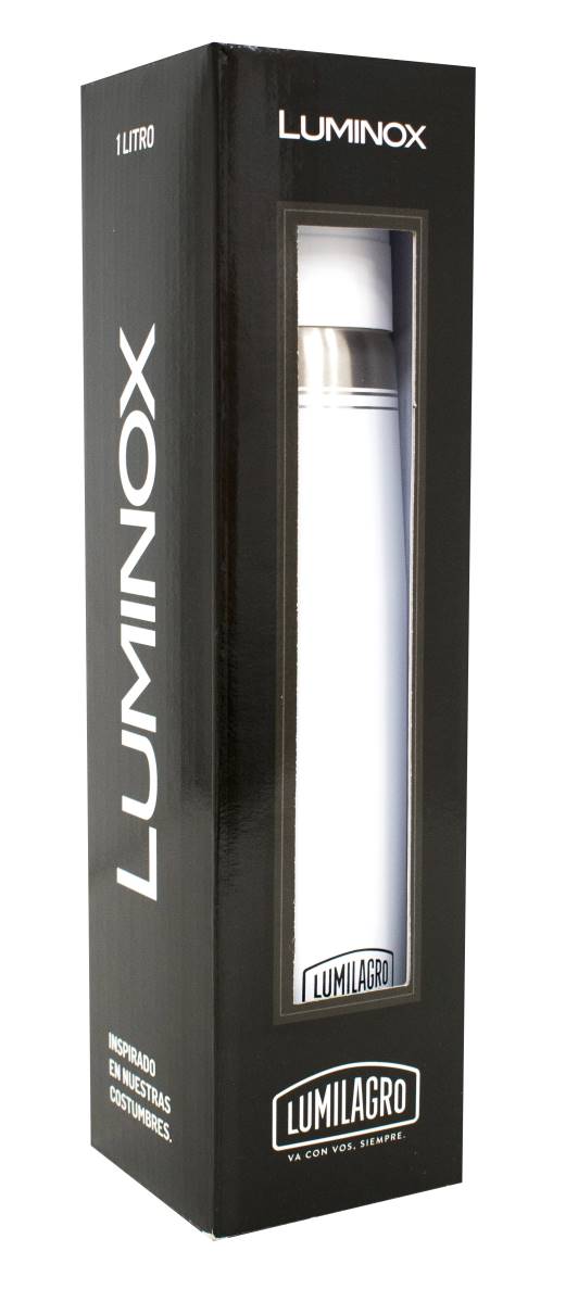 Termo Luminox blanco. Su doble pared de acero inoxidable garantiza una alta performance del producto y asegura el mantenimiento de la temperatura de líquidos fríos o calientes por muchas horas.