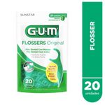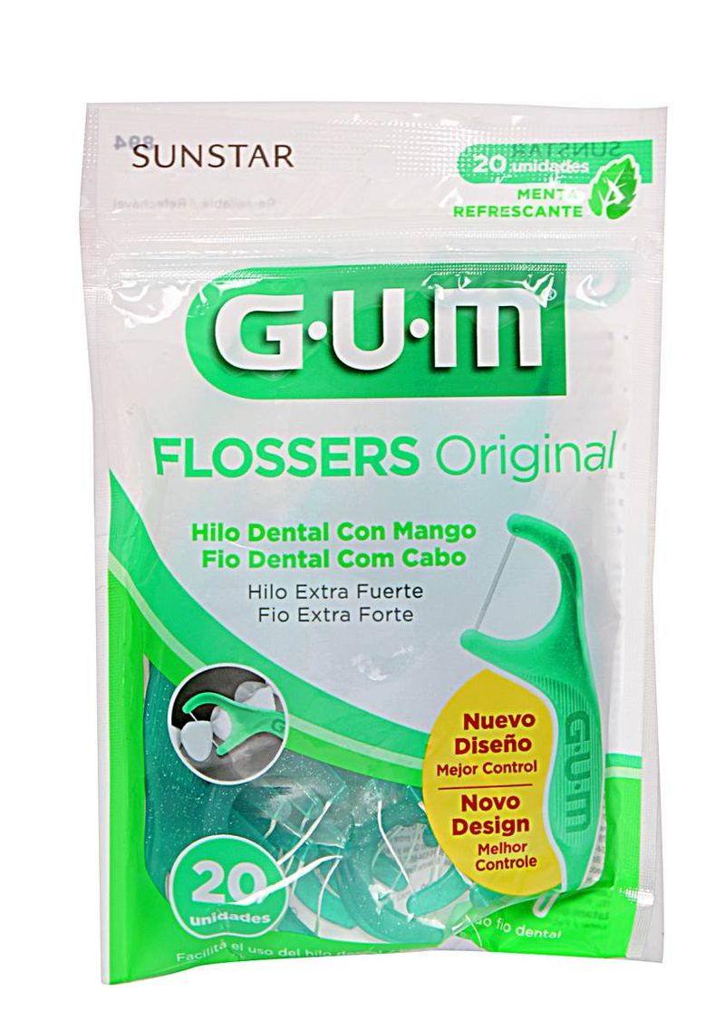 Hilo dental con mango G.U.M Flossers original por 20 unidades, posee un mango ergonómico y de fácil control con hilo dental precargado encerado que resulta suave y delicado.