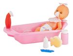 Mi bebé Yoly Bell ! el bebote cuenta con un cuerpo de plástico y extremidades de goma, sus ojos se abren y cierran cuando cambia de posición, además cuenta con una bañera y ducha