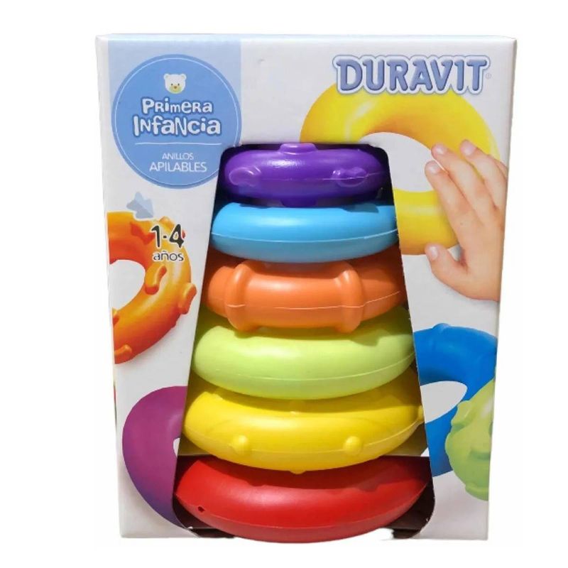 Torre apilable de anillos Duravit, la torre posee una base con forma cónica para poder colocar los anillos de menor a mayor. Los anillos poseen relieves diferentes