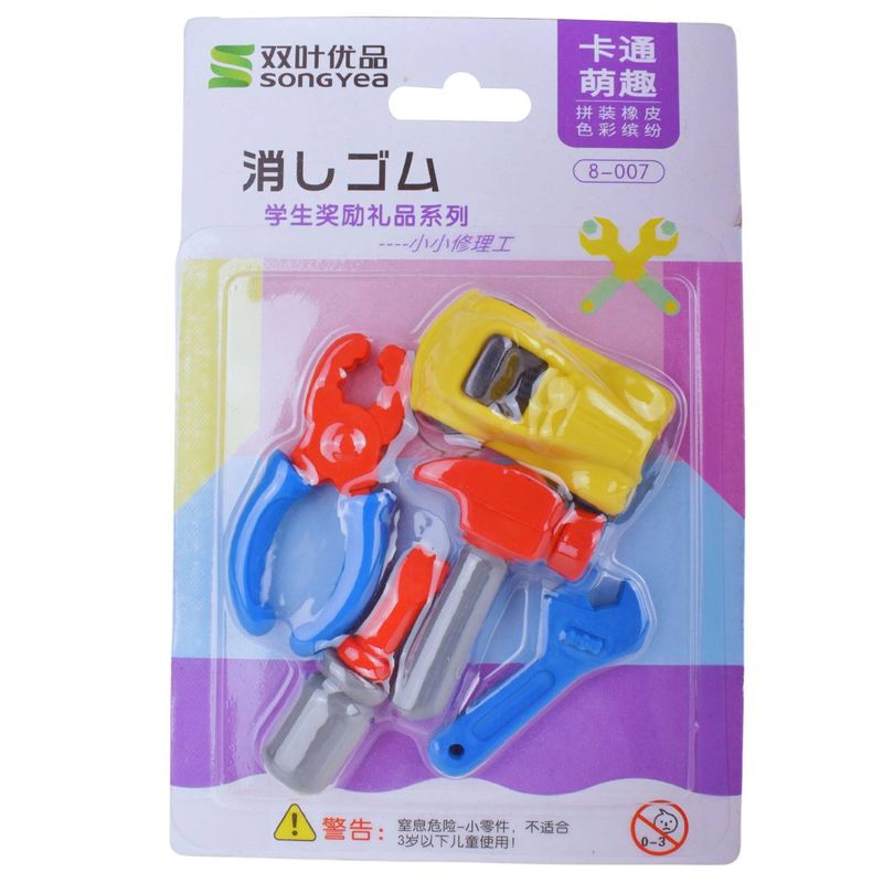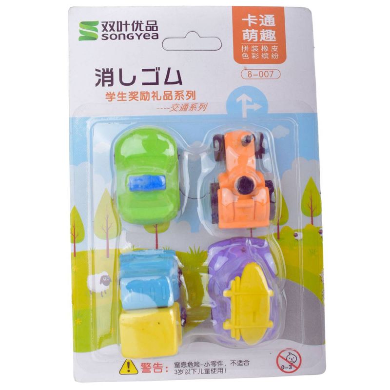 Gomas de borrar con diseños de vehículos y herramientas, ideales para uso escolar y para incentivar la creatividad. Diseñadas para borrar suavemente trazos de lápiz mientras aportan diversión y motivan el estudio.