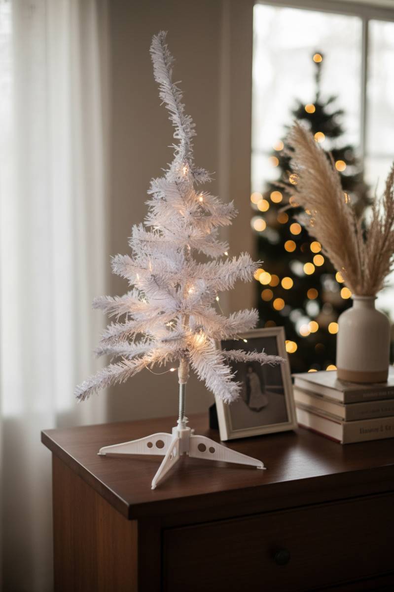 Pino navideño blanco de 60 cm, ideal para decorar espacios pequeños con un estilo moderno y luminoso. Ideal para escritorios, mesas, recepciones o rincones pequeños donde se busca sumar un toque navideño sin ocupar mucho espacio.