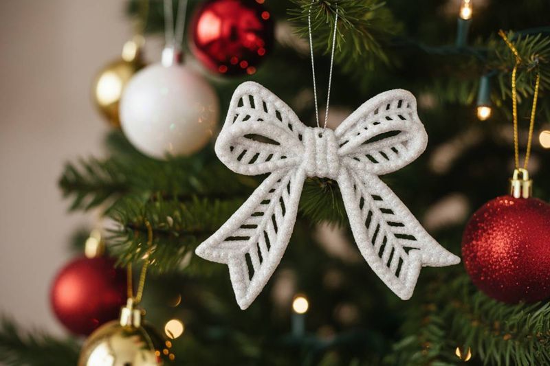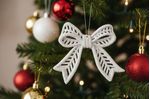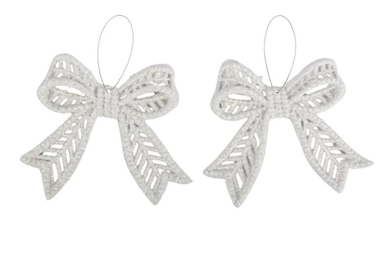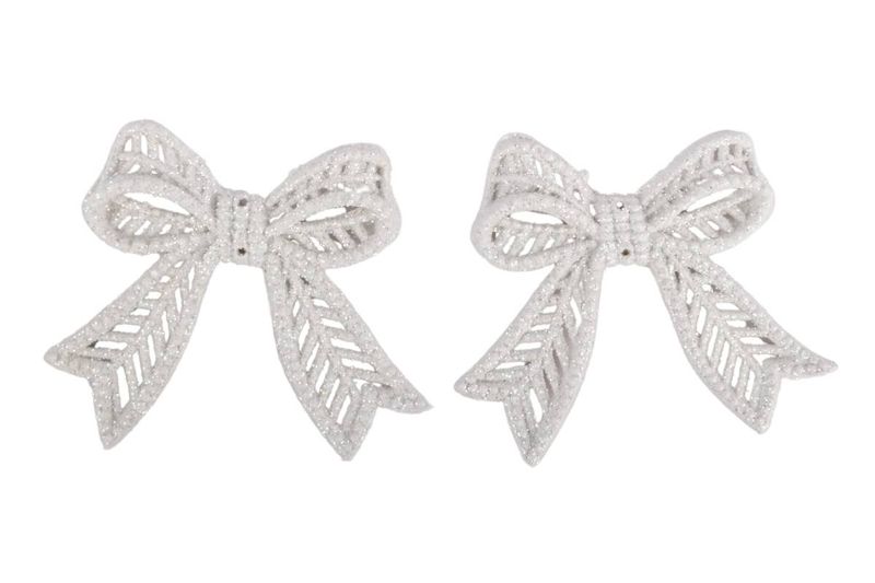 Par de moños navideños de 8 cm con diseño calado y acabado con glitter, ideales para decorar el árbol o ambientes festivos. Perfectos para decorar el árbol, coronas, guirnaldas, centros de mesa o envolver regalos de forma elegante.