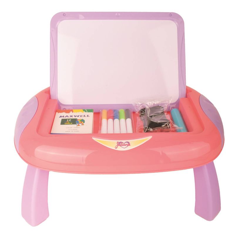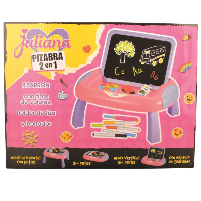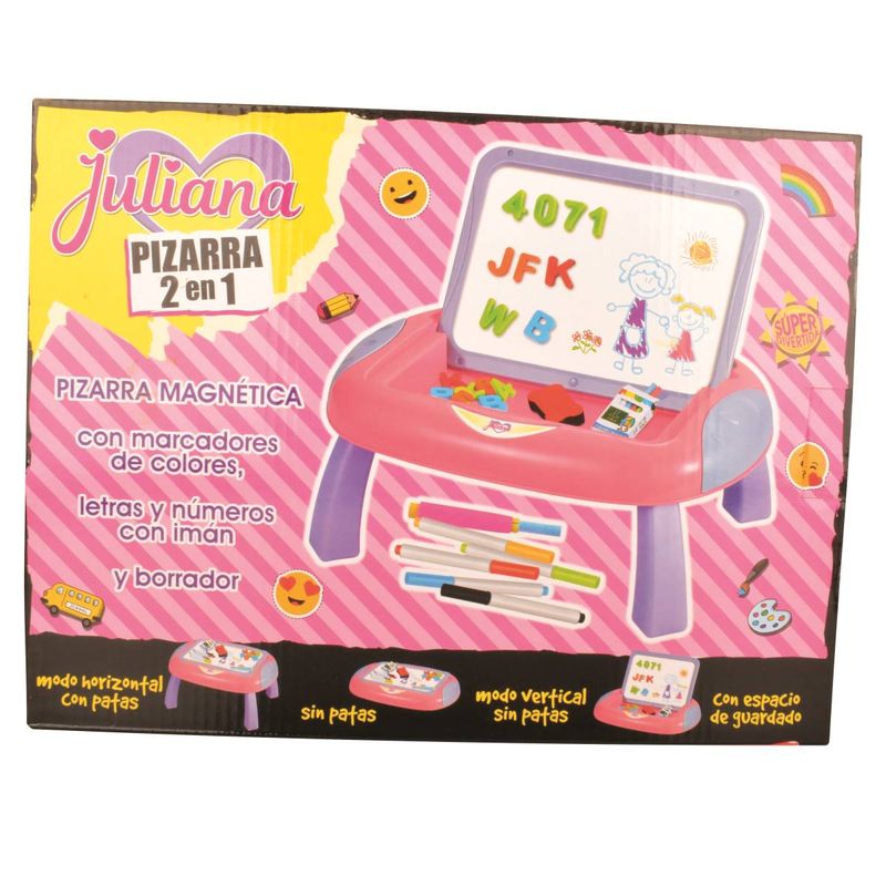 ¡Doble diversión para los pequeños artistas! Esta pizarra 2 en 1 Juliana ofrece un pizarrón tradicional para dibujar con tizas de colores y una pizarra magnética para usar con marcadores, letras y números imantados. Incluye accesorios para estimular la creatividad y el aprendizaje de los niños.