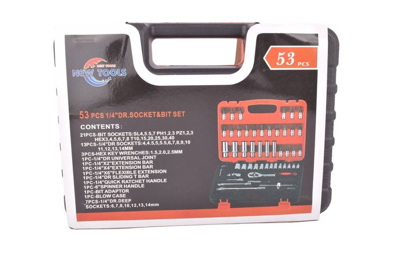 -Accesorios: 1 Ratchet rápido de 1/4", 1 Mango spinner de 1/4", 1 Adaptador de puntas de 1/4", 1 Junta universal de 1/4", 2 Barras de extensión de 1/4" (50 mm y 100 mm), 1 Barra de extensión flexible de 1/4" (150 mm), 1 Barra deslizante en T de 1/4".
