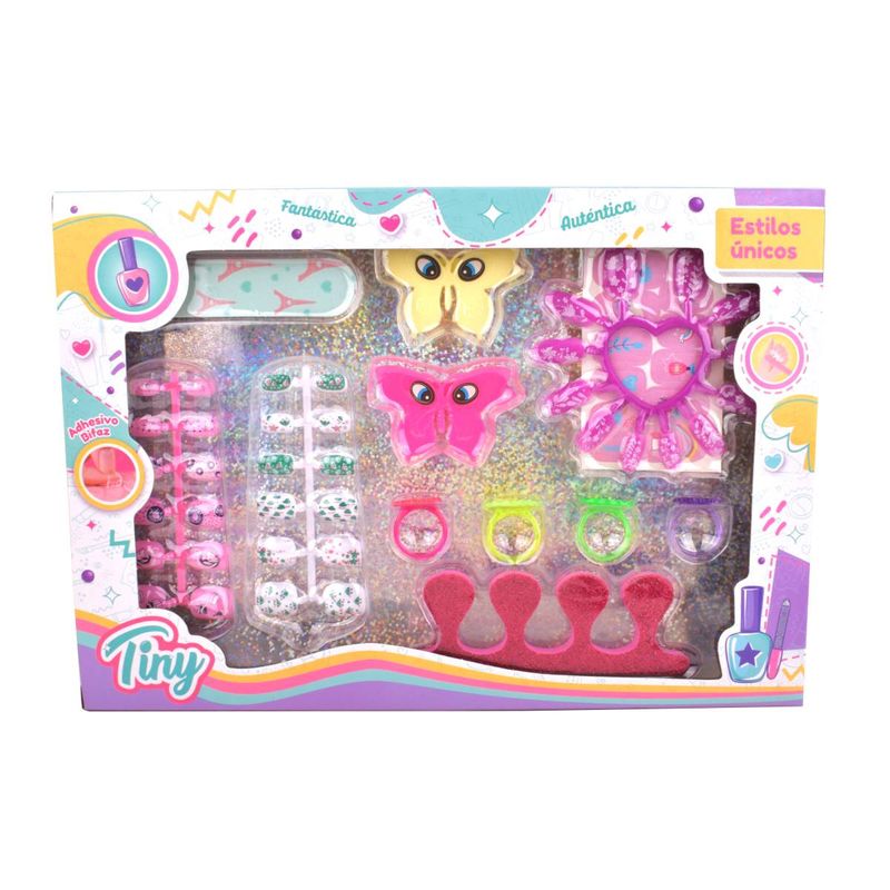 Desata tu creatividad y diviértete decorando tus uñas con el set Tiny Fantasy. Este completo set incluye una variedad de uñas postizas adhesivas con diseños fantásticos y auténticos, stickers brillantes, separador de dedos y anillos temáticos.
