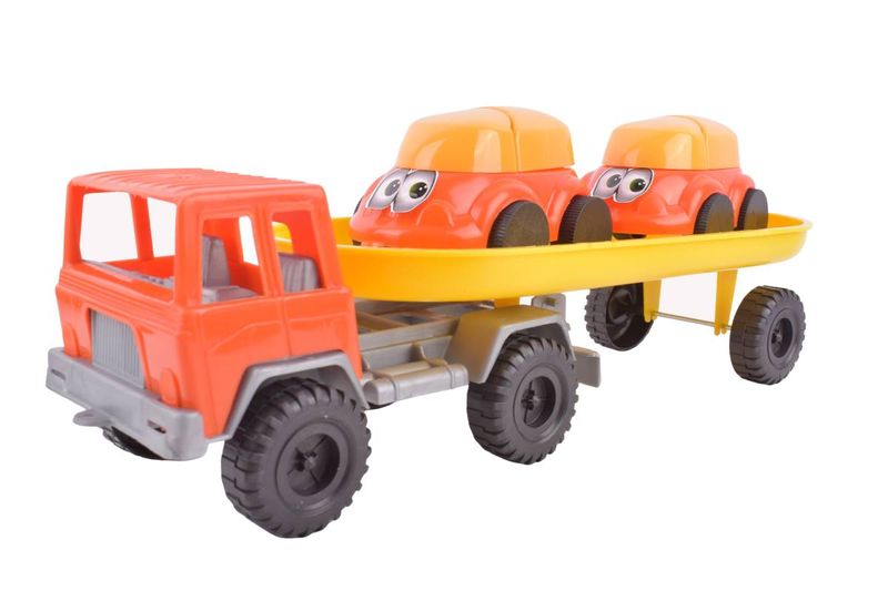 Vehículo de juguete tipo tractor con tráiler que incluye dos autitos, ideal para el juego recreativo infantil. Permite simular el transporte de vehículos, fomentando la imaginación, el juego simbólico y la coordinación manual. Su diseño robusto y uso sin baterías lo hacen práctico para jugar tanto en interiores como en exteriores.