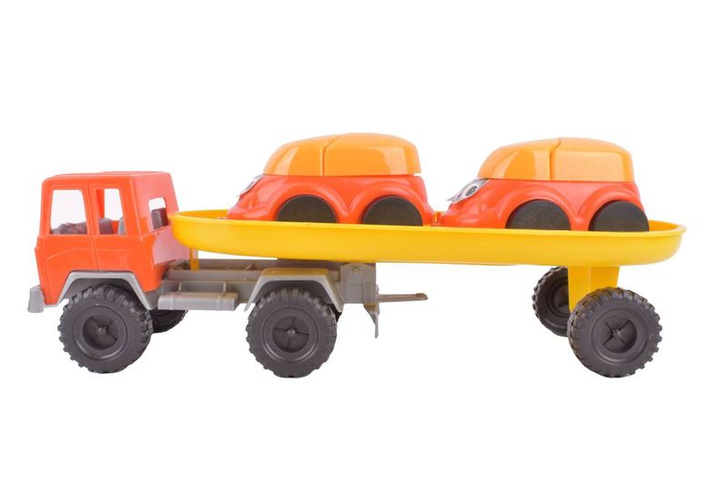 Vehículo JNG Plast con tráiler y 2 autitos, ideal para juegos de transporte y diversión infantil. Resistente y sin baterías. Cómpralo en Ferniplast.com