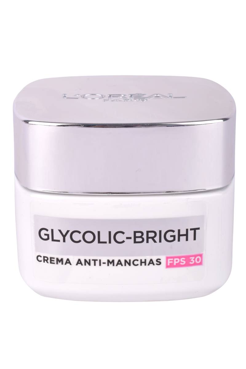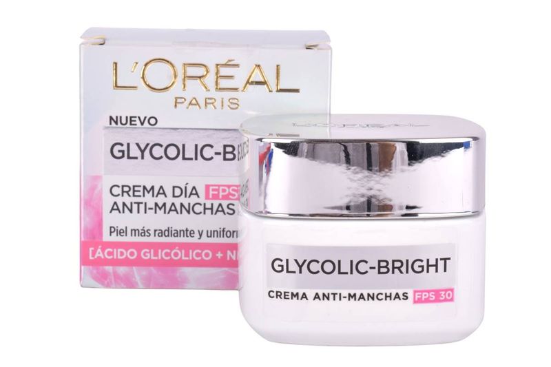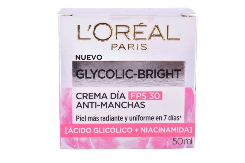 Crema L’Oréal Glycolic Bright Día FPS30 antimanchas. Ilumina y unifica el tono con ácido glicólico. Hidratación diaria. Cómprala en Ferniplast.com.