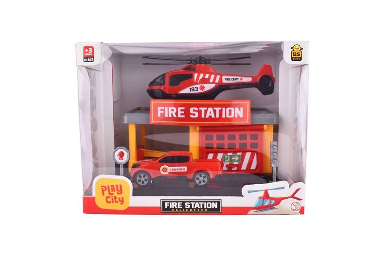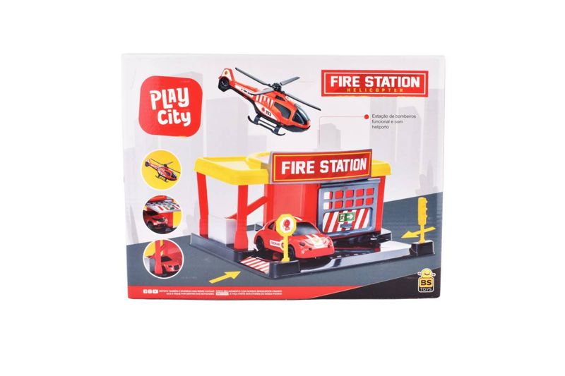 Set de estación de bomberos Play City. Incluye edificio, helicóptero y vehículo de bombero. Fomenta el juego imaginativo y de rol. Ideal para niños +3 años.