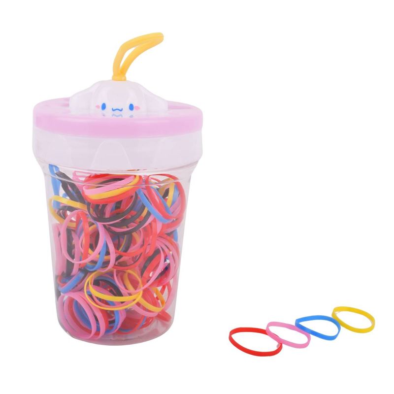 Frasco con gomitas finitas para cabello en colores surtidos, ideal para trenzas, colitas pequeñas y peinados con divisiones. Incluye tapa decorada con diseño infantil y asa superior, que facilita su transporte y lo convierte en un accesorio práctico para uso diario.