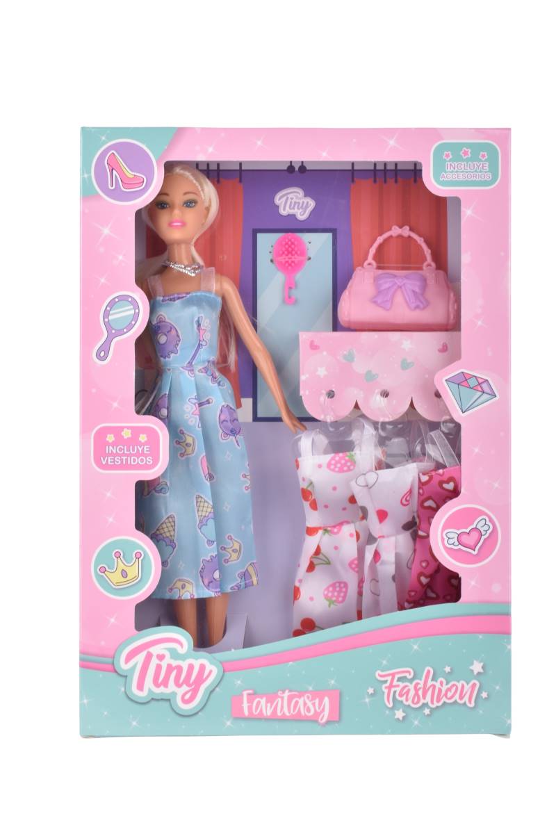 Muñeca "Tiny Fashion" con accesorios para crear diferentes looks. Incluye vestidos adicionales, un cepillo para el cabello y una cartera para complementar su estilo.