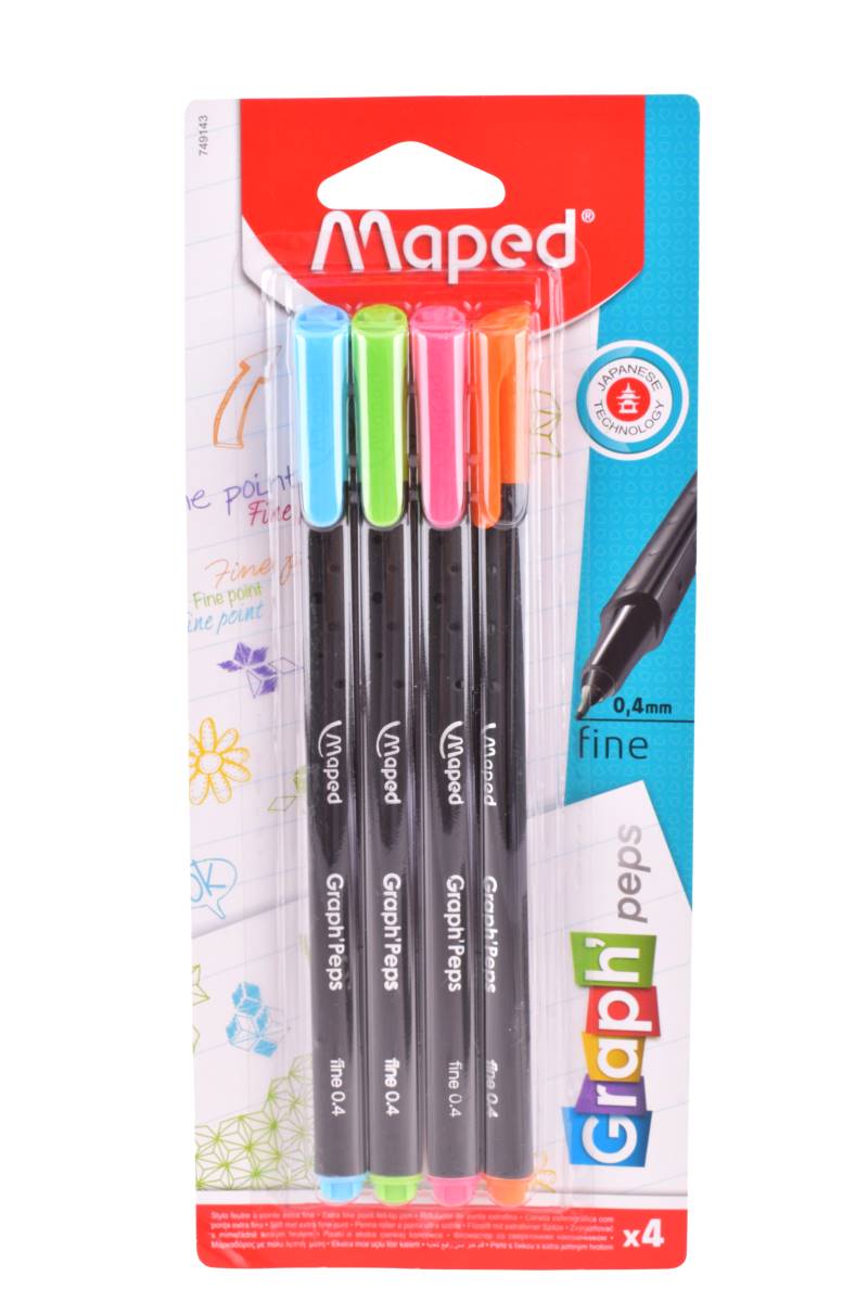 Set de 4 microfibras Maped Graph'Peps de punta fina 0.4mm, ideales para escribir, dibujar y detallar. Con tecnología japonesa que asegura trazos nítidos y colores vibrantes. ¡Perfectas para estudiantes, artistas y profesionales que buscan precisión y calidad!