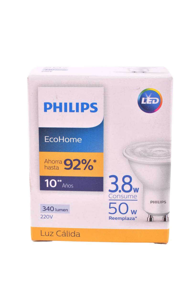 Lámpara LED Philips dicroica GU10 3.8W luz cálida, bajo consumo y gran rendimiento. Ideal para spots. Cómpralo en Ferniplast.com