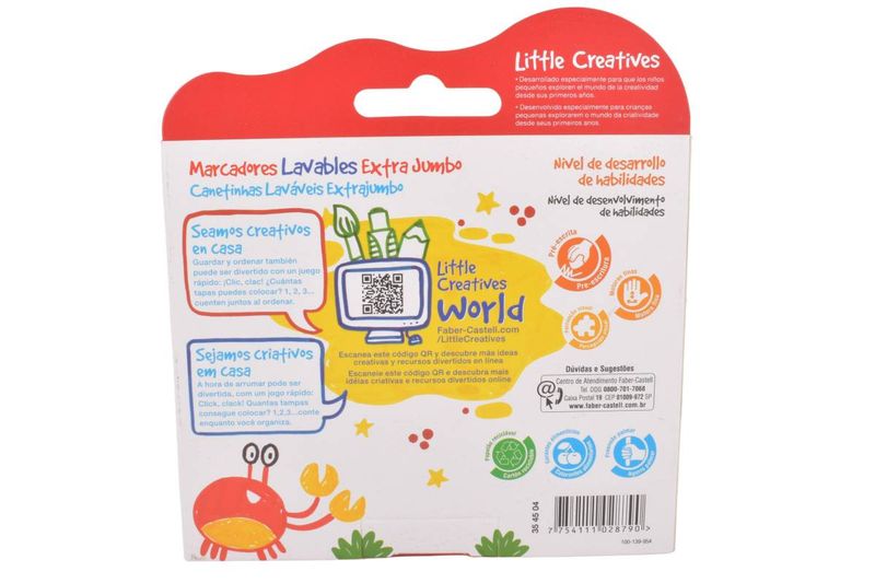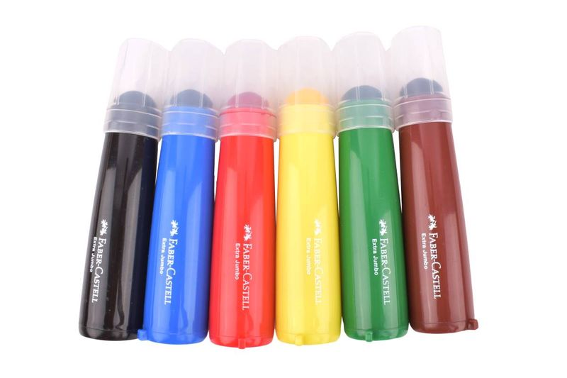 Set de 6 marcadores Extra Jumbo Faber-Castell, ideales para manos pequeñas y actividades creativas. Tinta lavable para un uso más práctico en casa o la escuela. Perfectos para dibujar, colorear y realizar actividades creativas infantiles, facilitando el agarre y el control del trazo.