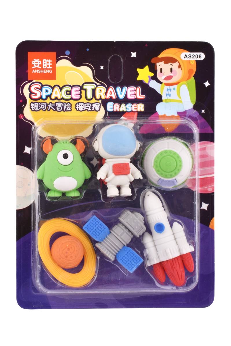Goma de borrar Space Travel set x6 con divertidos diseños espaciales, ideal para el cole y cartucheras. Sumá color y diversión. Cómpralo en Ferniplast.com