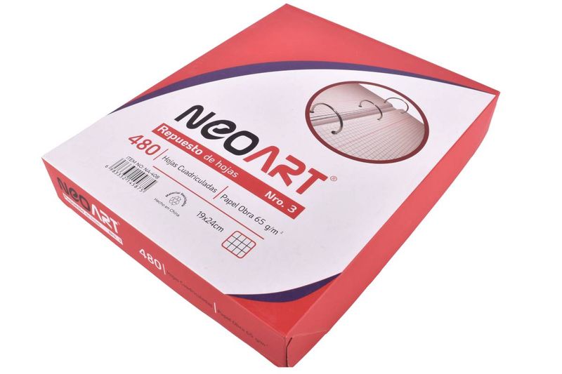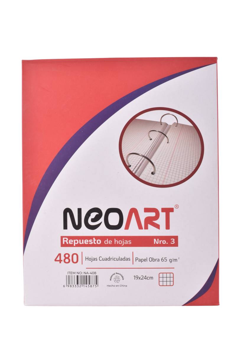 Repuesto de hojas Neo Art N°3 con 480 hojas cuadriculadas, ideal para recambio en carpetas escolares o de oficina, ofreciendo un formato práctico para el uso diario.