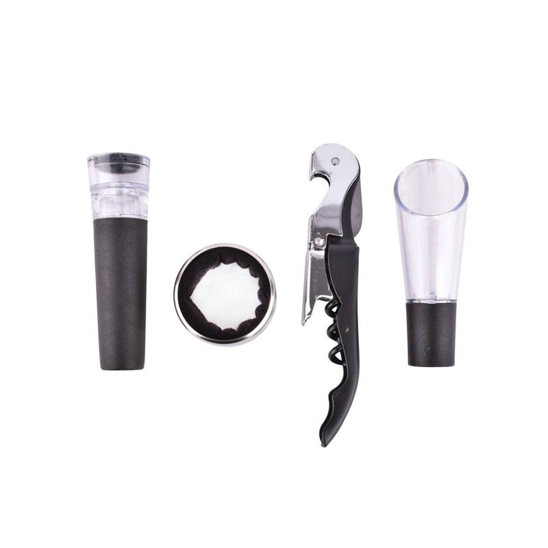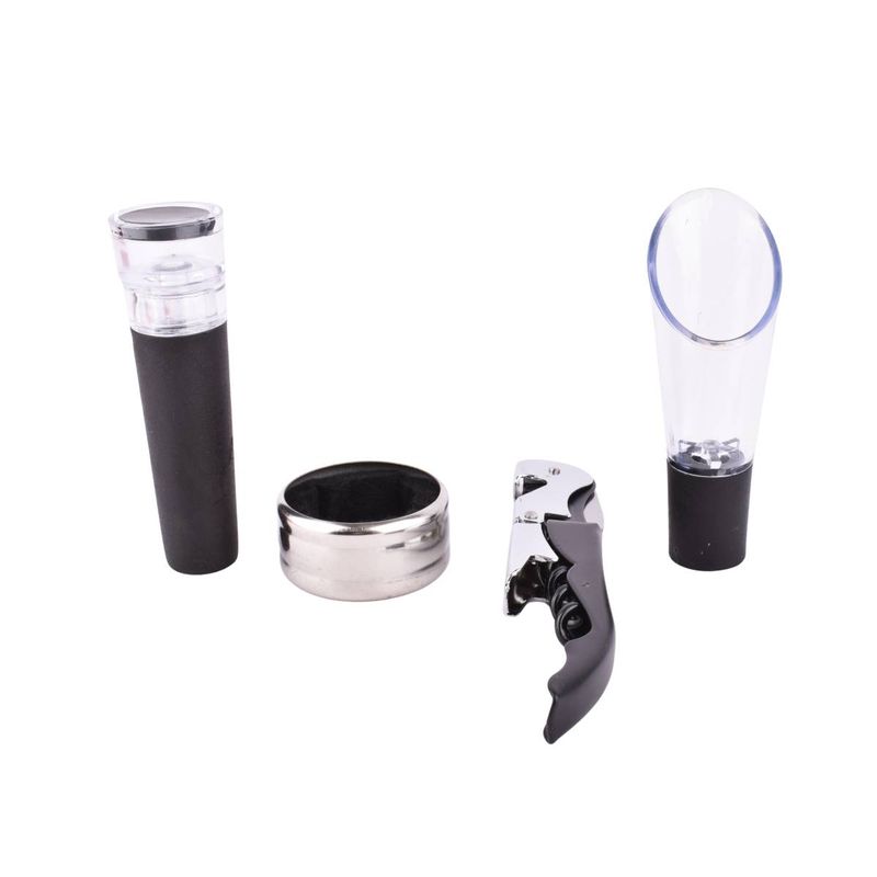 Presenta tus vinos con distinción usando este set de accesorios, elegantemente empaquetado en una caja. Incluye herramientas esenciales para abrir, servir y preservar tus botellas favoritas, haciendo de cada brindis una experiencia sofisticada. Ideal para regalar.