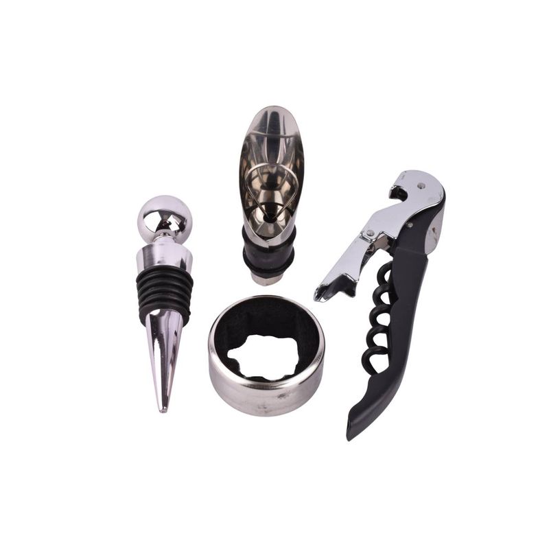 Set de vino de 4 piezas ideal para abrir, servir y conservar botellas con practicidad y estilo. Perfecto para uso en casa o como regalo. Ideal para abrir botellas de vino, servir sin derrames y conservar el contenido por más tiempo.