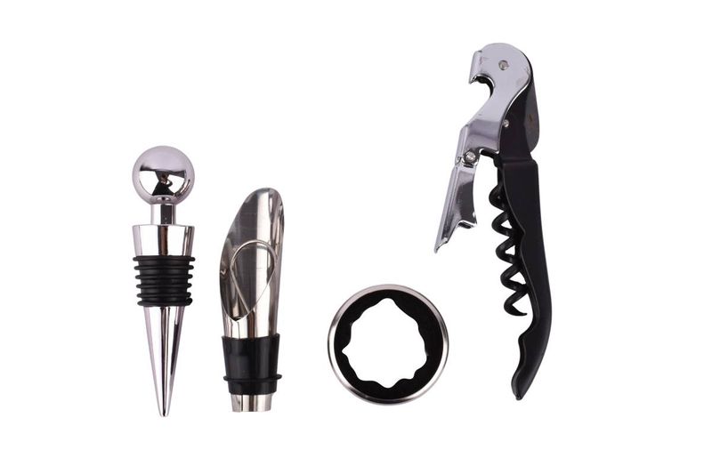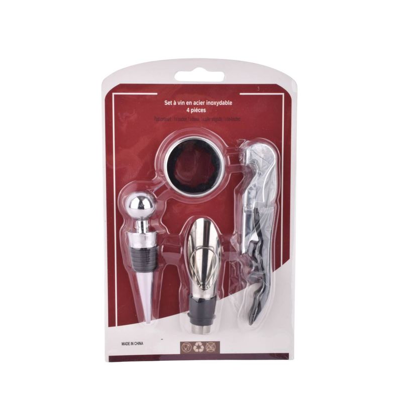 Set de vino 4 piezas con sacacorchos, tapón, vertedor y aro antigoteo. Ideal para servir y conservar vinos. Elegí el tuyo hoy en Ferniplast.com.