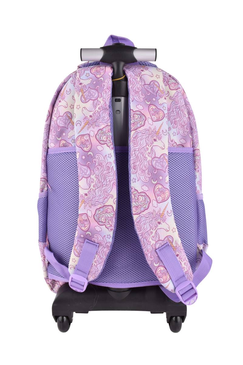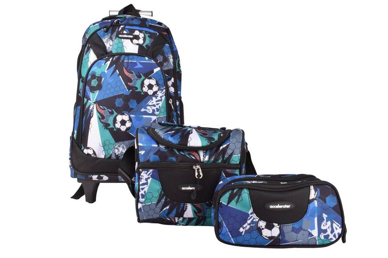 Este set escolar es perfecto para los pequeños fanáticos del fútbol y unicornios. Incluye una mochila con ruedas, lonchera y cartuchera con estampado colorido.