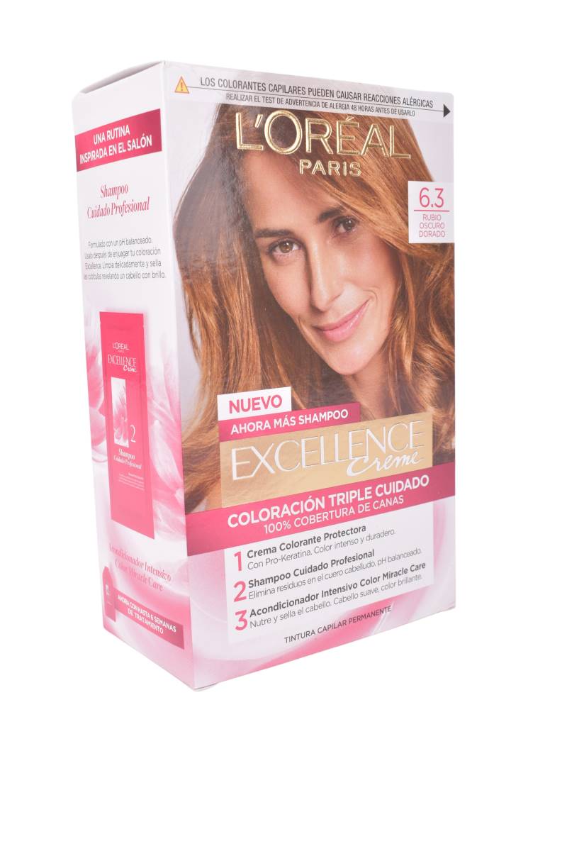 La tintura capilar permanente L'Oréal Paris Excellence Creme en el tono 6.3 Rubio oscuro dorado te brinda una coloración rica y duradera con 100% cobertura de canas. Su fórmula de triple cuidado protege tu cabello antes, durante y después de la coloración, dejándolo suave, fuerte y con un color profundo y luminoso.