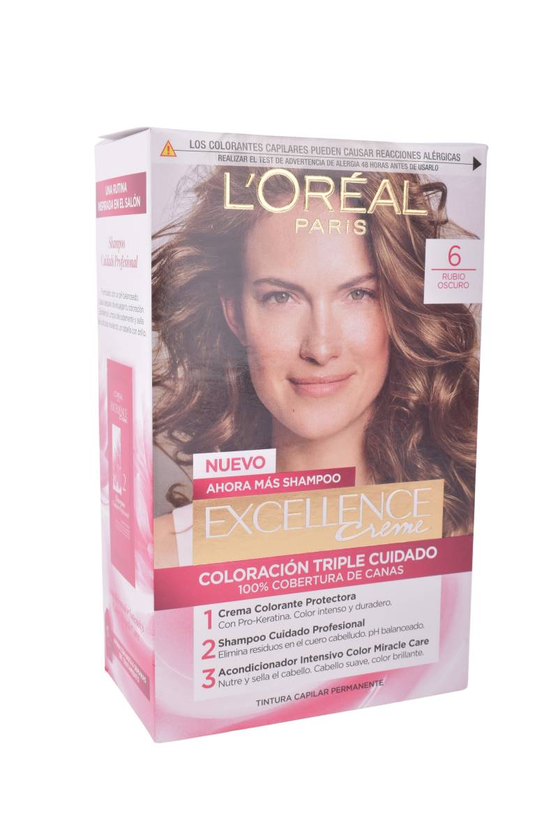 La tintura capilar permanente L'Oréal Paris Excellence Creme en el tono 6 Rubio oscuro te brinda una coloración rica y duradera con 100% cobertura de canas. Su fórmula de triple cuidado protege tu cabello antes, durante y después de la coloración, dejándolo suave, fuerte y con un color profundo y luminoso.