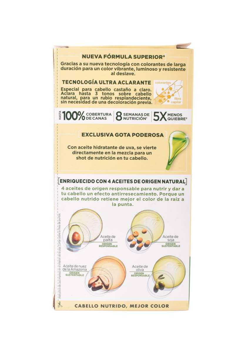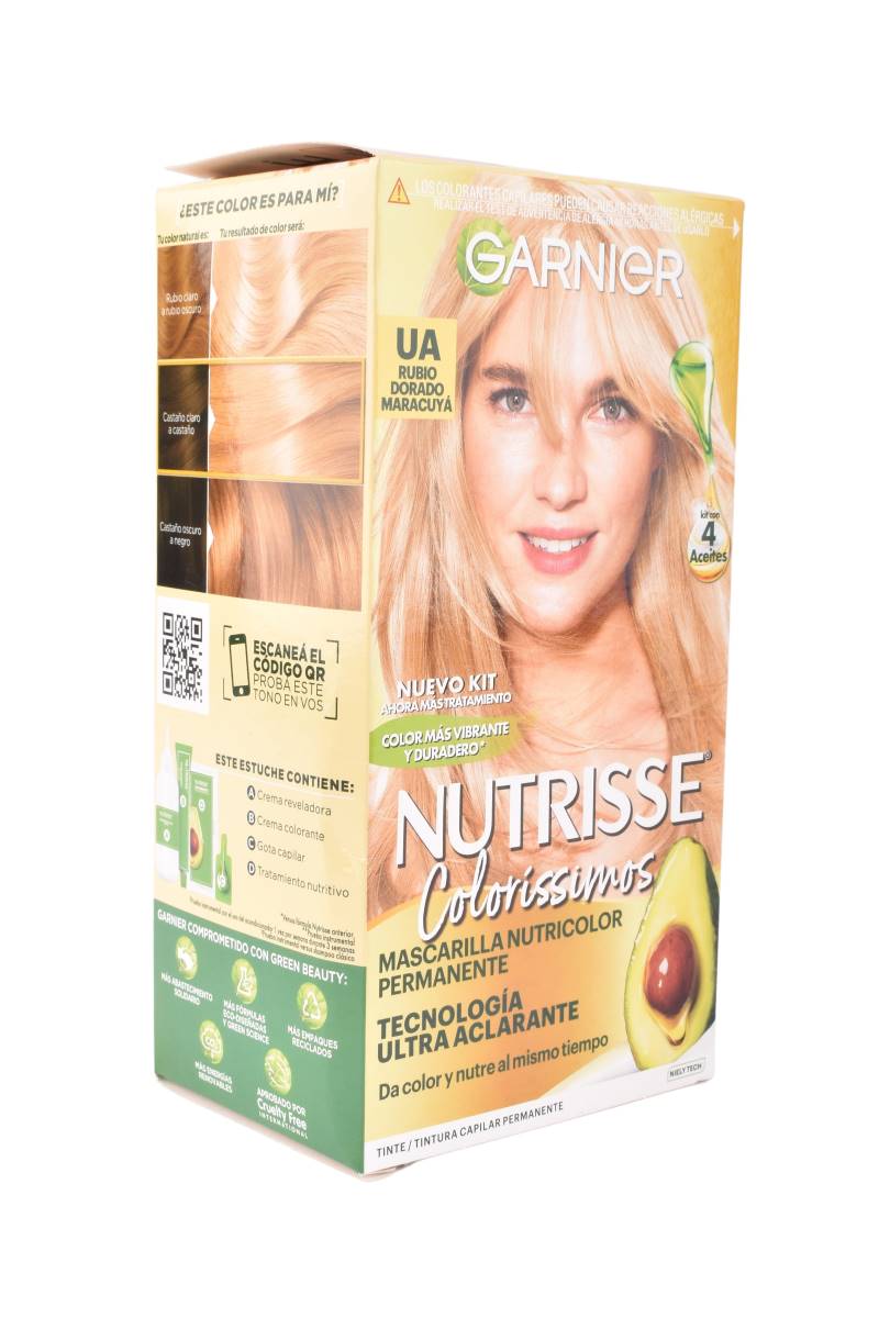 Ilumina tu cabello con el tinte permanente Garnier Nutrisse Coloríssimos Rubio Dorado Maracuyá UA. Su fórmula enriquecida con 4 aceites nutre intensamente el cabello mientras proporciona un color rubio dorado vibrante y luminoso. Disfruta de un cabello suave, brillante y con un color radiante.