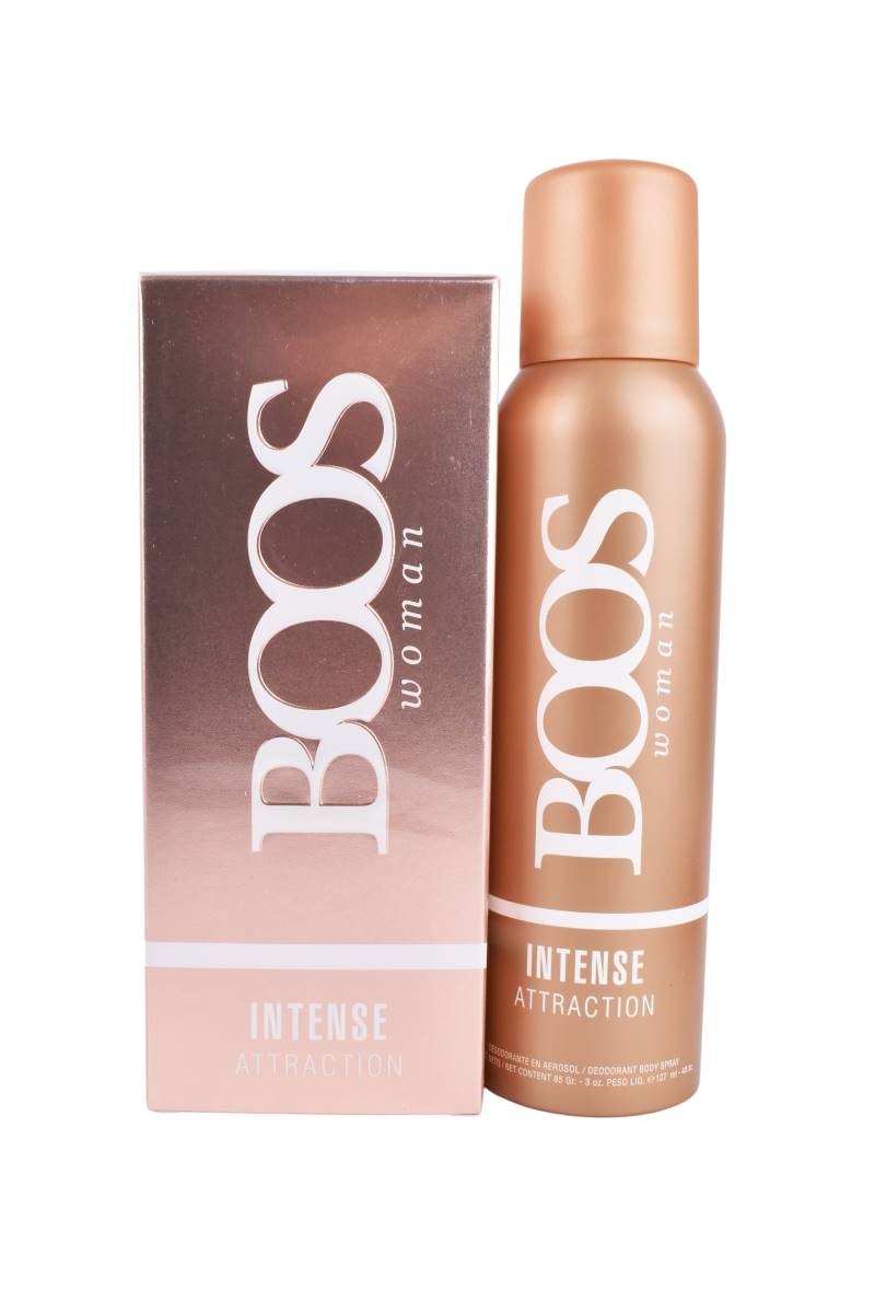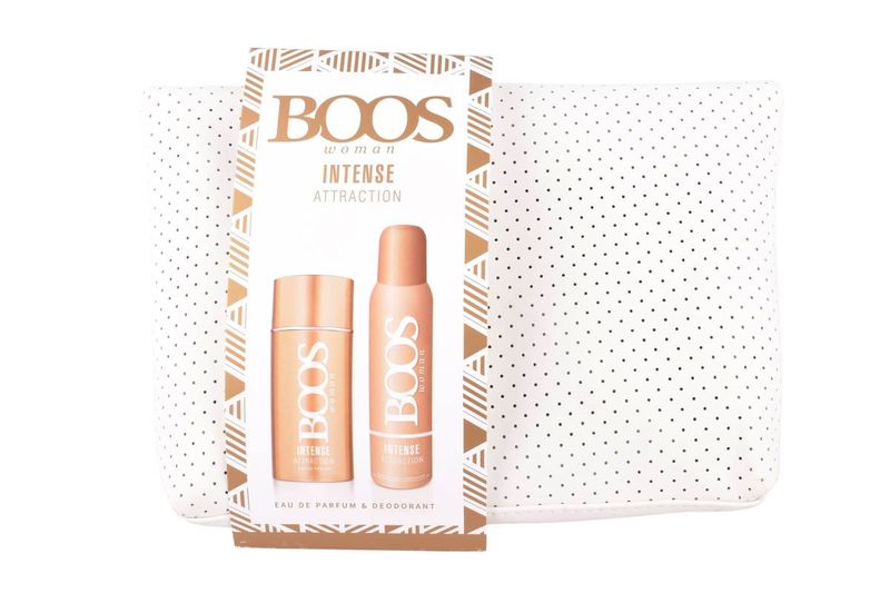 Desata una estela seductora y duradera con el set BOOS Intense Attraction Woman. Incluye el Eau de Parfum, el Desodorante spray y un práctico neceser de regalo, todo en un atractivo tono oro rosado.