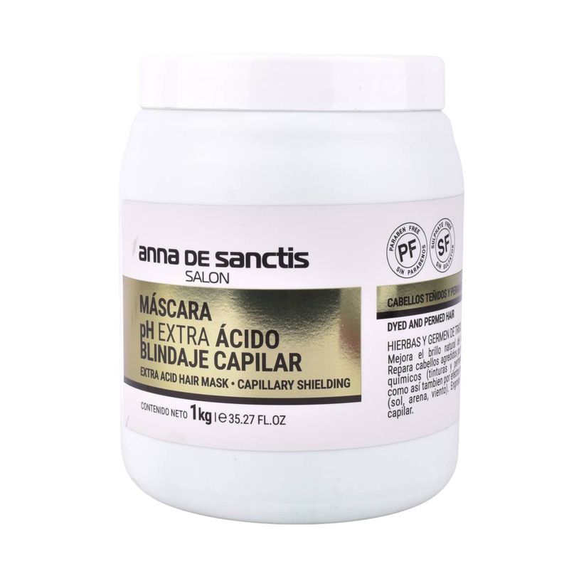La máscara capilar Anna de Sanctis Extra Ácido 1kg hidrata y repara intensamente el cabello, aportando fuerza, brillo y suavidad desde la primera aplicación.