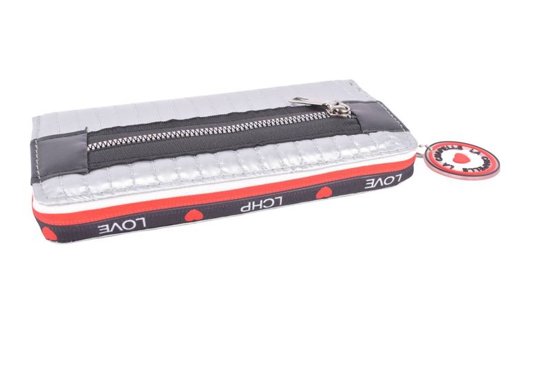 Organiza tus tarjetas, billetes y monedas con estilo en esta billetera moderna. Su diseño único con una cinta decorativa con la palabra "LOVE" y pequeños corazones le da un toque original y llamativo. Compacta pero con espacio suficiente para llevar lo esencial, será tu compañera perfecta para el día a día.