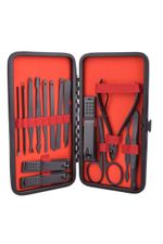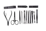 Contiene 15 piezas: cortaúñas, tijeras, limas, pinzas, herramientas para cutículas, etc.