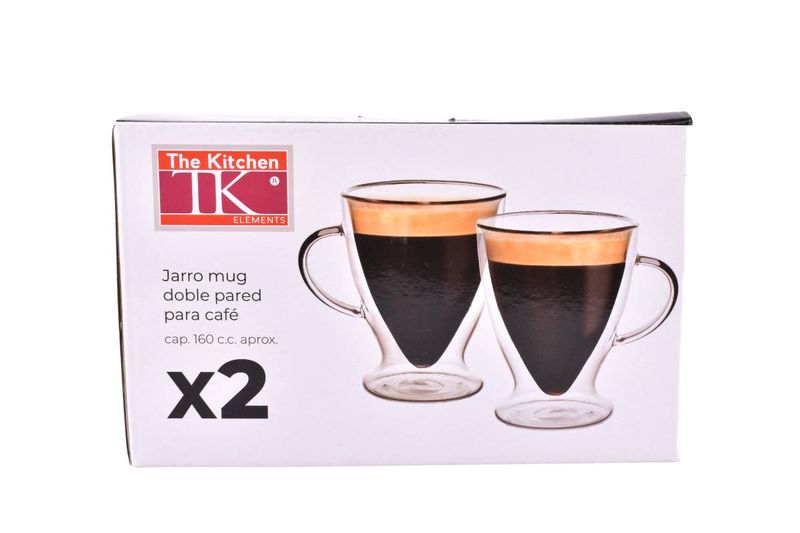 Disfruta tu café con el Set de 2 Jarros Mug de Doble Pared The Kitchen Elements. Fabricados en vidrio borosilicato de 160cc, mantienen tu café caliente por más tiempo.