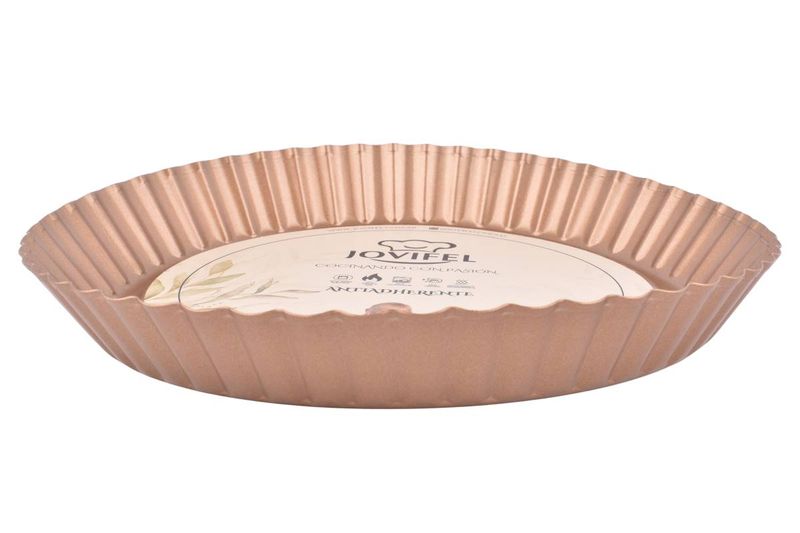 Prepará tartas, budines y bizcochuelos con esta tartera Jovifel fija de 24 cm en color cobre. Su diseño resistente asegura una cocción pareja y un horneado uniforme, ideal para tus recetas dulces o saladas.