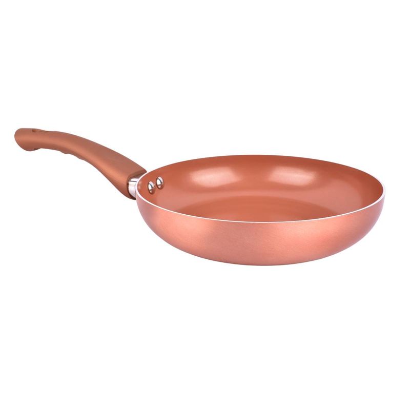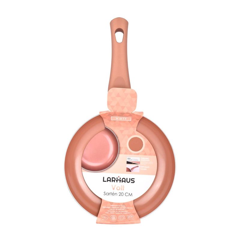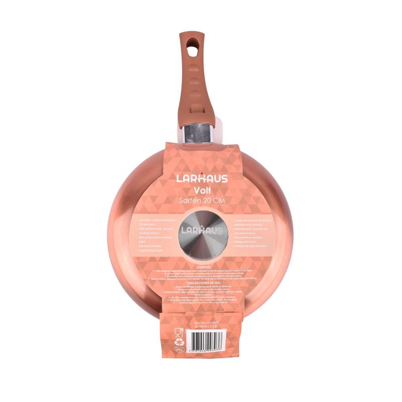 Sartén Larhaus Volt Copper de 20 cm con revestimiento cerámico Performance Ceramic Coating, que permite cocinar con poca grasa y es libre de PFOA. Su base de cobre garantiza una distribución uniforme del calor, mientras que el mango soft-touch brinda comodidad y seguridad al manipularla. Ideal para cocinar de manera saludable y práctica.