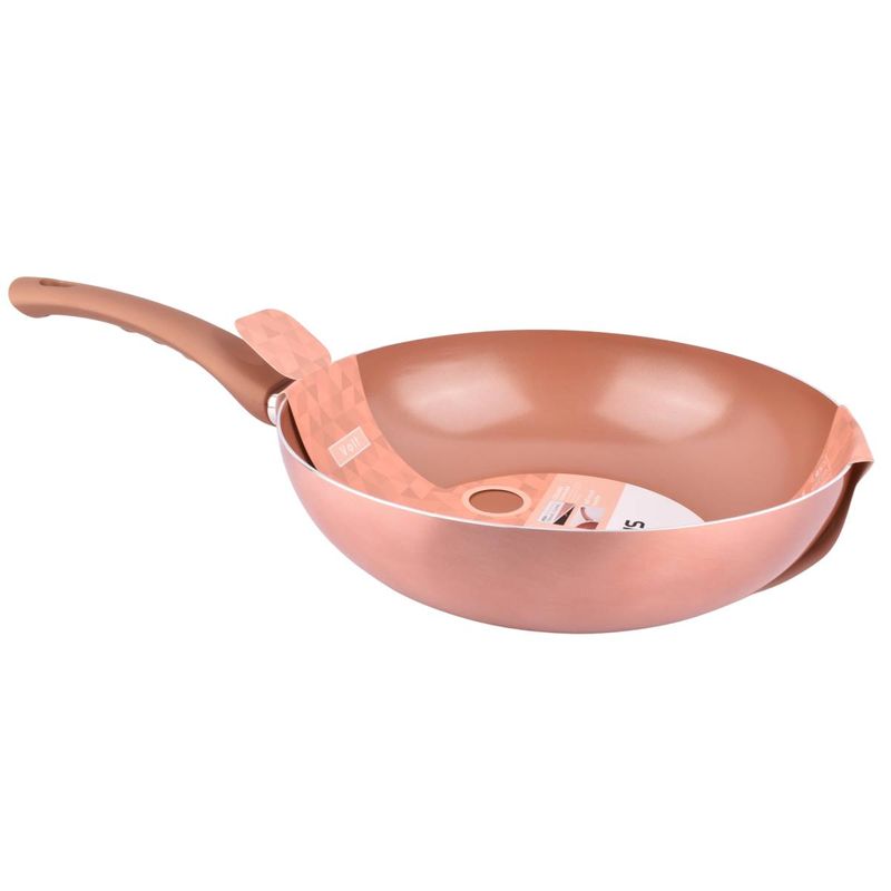 Cociná con estilo y eficiencia con el wok Larhaus Volt Copper de 28 cm. Su recubrimiento antiadherente permite preparar salteados, verduras y carnes sin que se peguen, combinando durabilidad y diseño moderno.