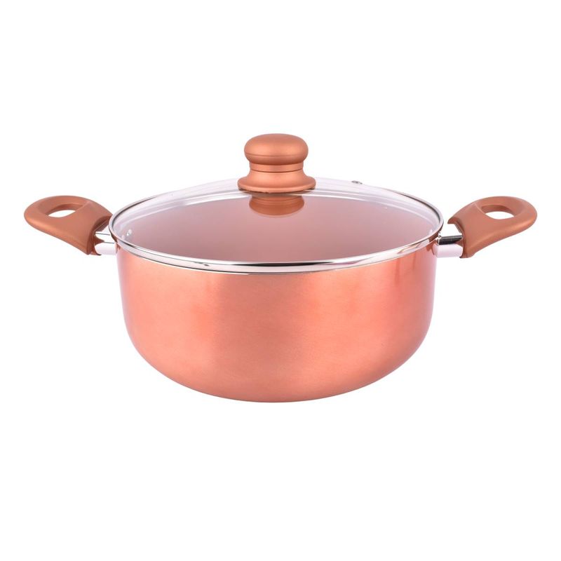 Cociná con estilo y eficiencia con la cacerola Larhaus Volt Copper de 24 cm. Su recubrimiento antiadherente y fondo de cobre asegura una distribución uniforme del calor, facilitando la preparación de guisos, salsas y otras recetas con resultados perfectos.
