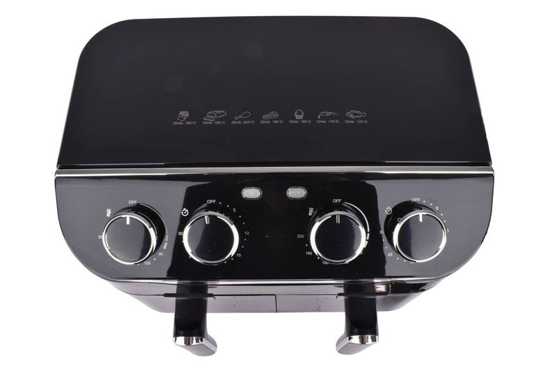 Freidora de aire doble de 5L+5L que permite cocinar dos preparaciones a la vez con menos grasa y gran potencia de 2800W. Perfecta para preparar papas fritas, carnes, vegetales y snacks sin necesidad de utilizar aceite. Permite cocinar de forma simultánea dos platos con controles independientes.