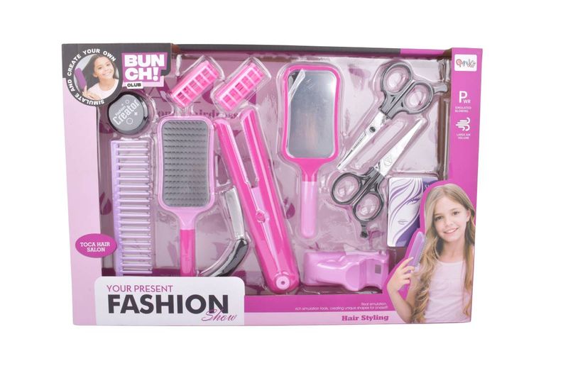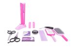 Contiene 12 piezas. (Plancha de pelo de juguete, cepillo, peine, ruleros, tijeras de juguete, espejo de mano, etc)