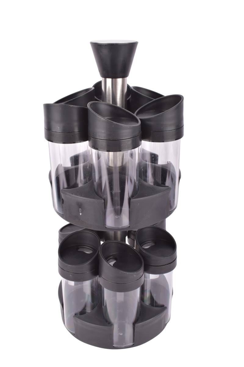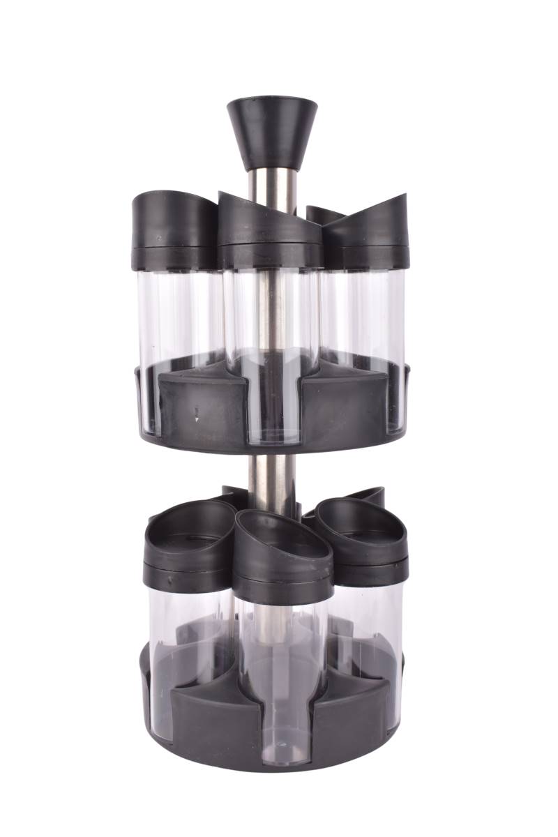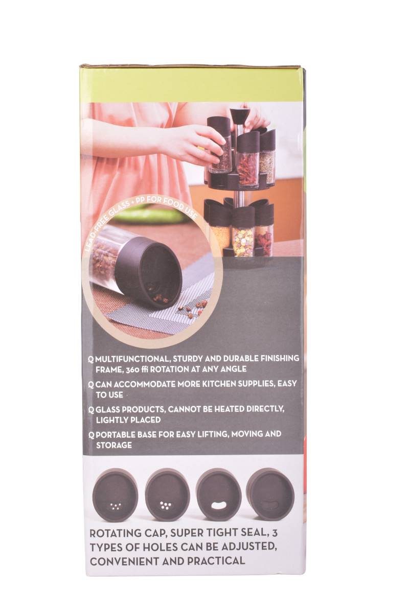 Organiza tus especias de forma práctica y elegante con este especiero giratorio. Incluye 12 frascos de plastico con tapas herméticas y ajustables en tres tipos de orificios. Su base giratoria 360° permite acceder fácilmente a todas tus especias mientras ahorras espacio en tu cocina.