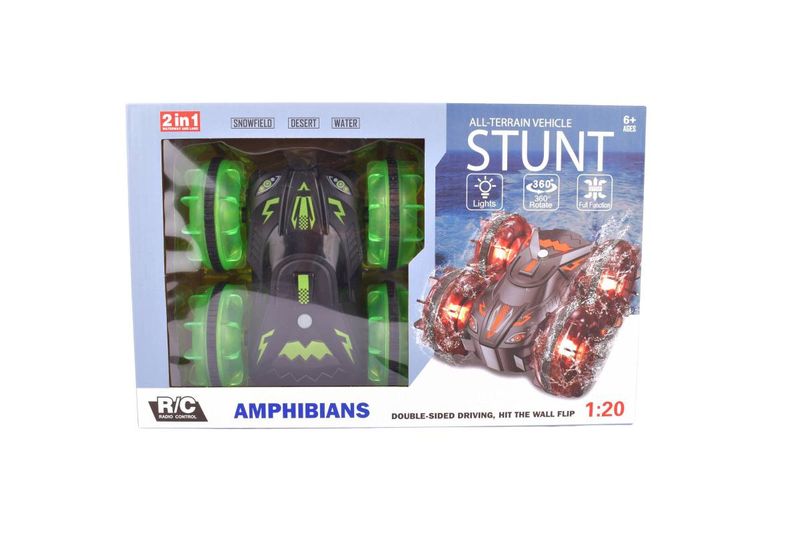 Auto acrobático anfibio con giros 360°, doble cara y luces. Recorre tierra, agua, arena y nieve. Incluye control remoto, batería recargable y cargador USB. Ideal para acrobacias, saltos, giros completos y conducción extrema en múltiples superficies: pasto, arena, agua, nieve y suelo plano.