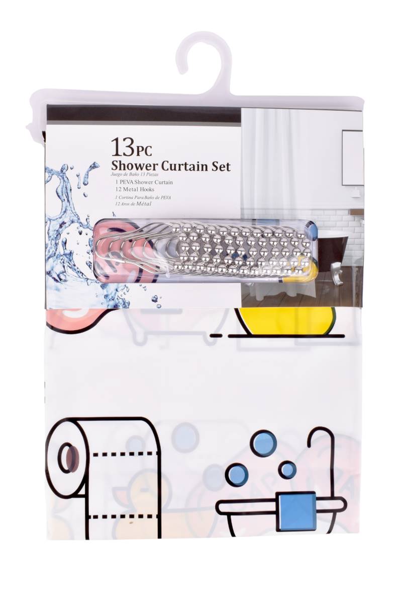 Renueva tu baño con este Set de Cortina de Ducha de 13 piezas. Incluye cortina de PEVA y 12 ganchos metálicos. Fácil de instalar y limpiar. ¡Estilo y funcionalidad en tu baño!
