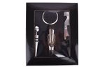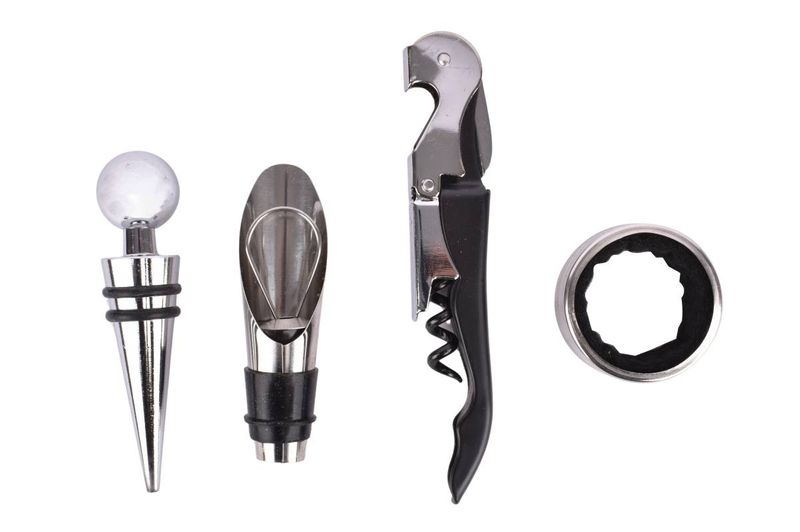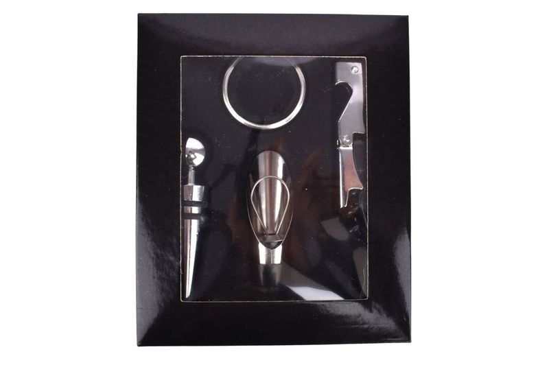 Elegante set de accesorios para vino 4 piezas en caja de regalo. Incluye sacacorchos, tapón, vertedor y aro antigoteo. Ideal para regalar o disfrutar en casa. ¡Un imprescindible para los amantes del vino!