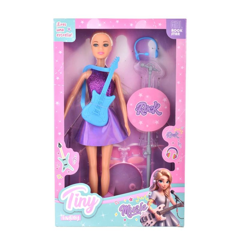 Conviértete en una estrella del rock con la muñeca Tiny "Rock Star". Esta muñeca viene con una guitarra eléctrica de juguete, micrófono y auriculares, ideal para horas de juego y conciertos en casa.