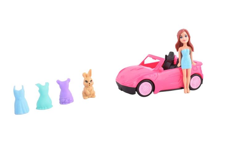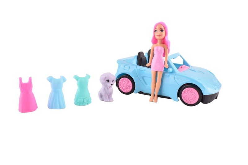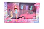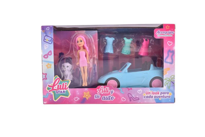 Contenido del Set: 1 Muñeca Luli Star, 1 Auto convertible rosa, 3 Vestidos adicionales y 1 Mascota.