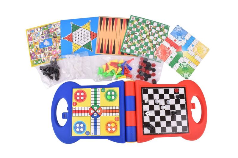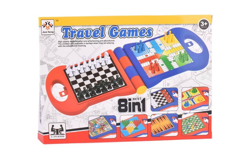 ¡La diversión nunca se detiene con nuestro set "Travel Games" 8 en 1! Incluye clásicos como ajedrez, damas y Serpientes y Escaleras en un formato portátil. Perfecto para niños de 3 años en adelante y para llevar a cualquier parte.
