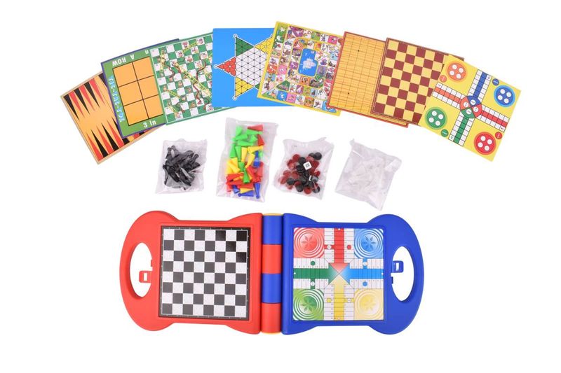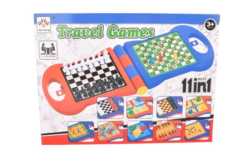 ¡La diversión nunca se detiene con nuestro set "Travel Games" 11 en 1! Incluye clásicos como ajedrez y damas en un formato portátil. Perfecto para niños de 3 años en adelante y para llevar a cualquier parte.