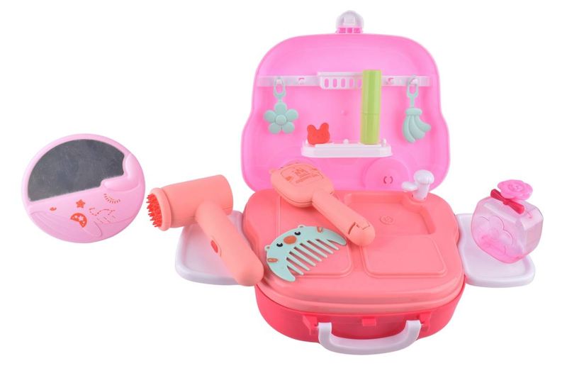 - Incluye accesorios como secador de pelo, espejo, peines, frascos de perfume de juguete, y "maquillaje" de juguete.