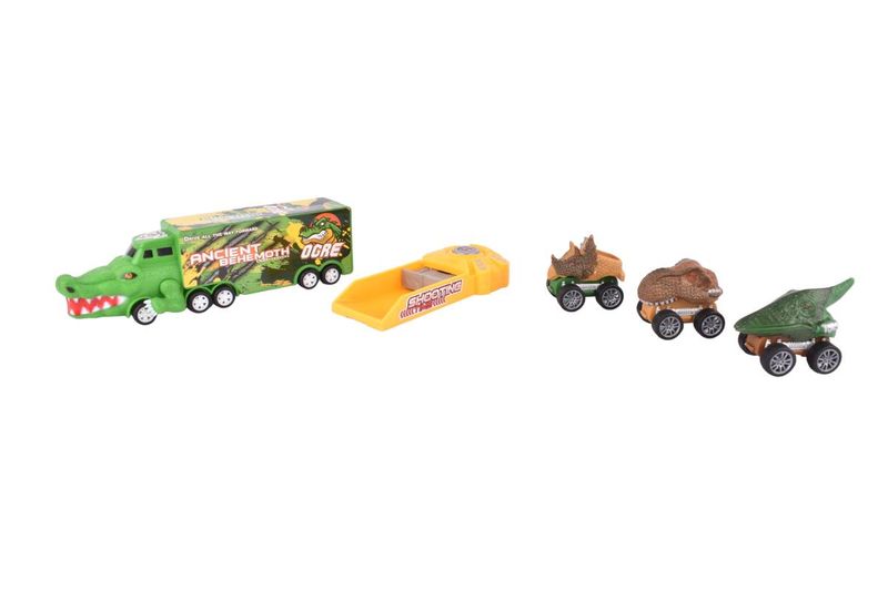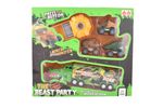 ¡Prepárate para la acción más salvaje con "The Beast Party"! Estos impresionantes camiones con cabezas de cocodrilo y decoraciones de dinosaurios no solo son geniales para exhibir, ¡sino que también lanzan autos! Solo presiona un botón y observa cómo los pequeños vehículos con forma de monstruo salen disparados.