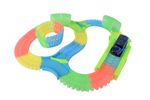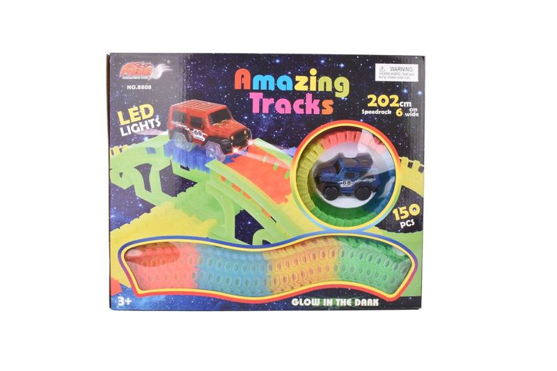 ¡Prepárate para la carrera más espectacular con "Amazing Tracks"! Esta increíble pista no es una cualquiera: es flexible, construible, ¡y brilla en la oscuridad! Con 202 cm de recorrido y 150 piezas para armar como quieras, la diversión es infinita. El auto incluido tiene luces LED, haciendo que cada giro y salto sea un verdadero espectáculo visual, incluso en la oscuridad.